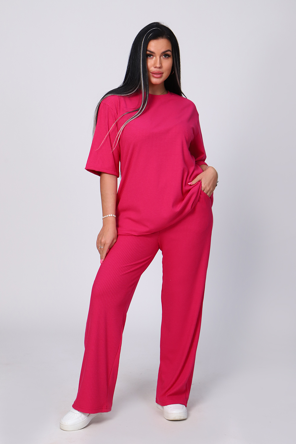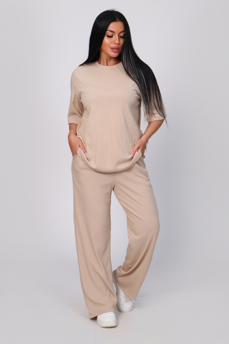 Костюм женский с широкими брюками. Кофта оверсайз удлинённая, рукав до локтя, горловина обработана обтачкой. Брюки длинные, широкие с карманами. Большой размерный ряд. На модели 48 размер.