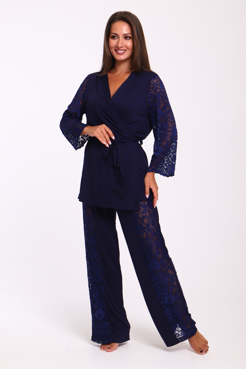 Домашний женский костюм, состоит из двух изделий, халат на запах и брюки, костюм выполнен из вискозы 95%, эластан 5%. Халат прямого силуэта с планкой, фиксируется поясом на держателях в боковых швах. Рукава из эластичного гипюра. Брюки прямые, широкие на эластичной резинке 2 см. по бокам брюк расположены соблазнительные вертикальные кружевные вставки от талии и до низа изделия, которые обеспечивают визуальное вытягивание силуэта и лаконично сочетаются с рукавами. Размерный ряд данного комплекта от 46 до 60 размера. Размеры костюма сдвоенные. На фото модель представлена в 46 размере.