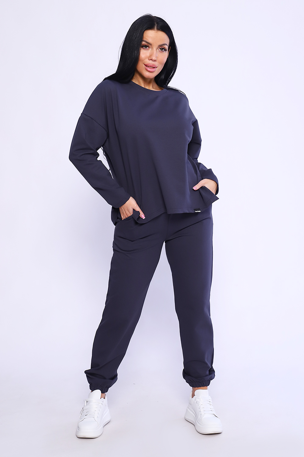 Костюм двойка выполнен из мягкого футера с лайкрой, туника с длинным рукавом, с декоративными разрезами на полочке и брючки с внутренним карманом с подгибкой внизу на резинку. Комфортное решение на каждый день.