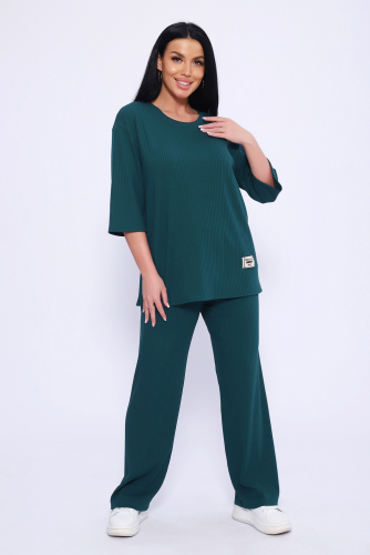 Костюм состоит из толстовки и брюк. Толстовка прямая, свободная, с капюшоном, с длинным рукавом на манжете. Низ полочки и спинки завершен поясом. Брюки с карманами, на поясе. Вдоль боковых швов расположены лампасы из отделочного полотна.
