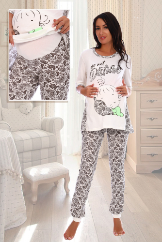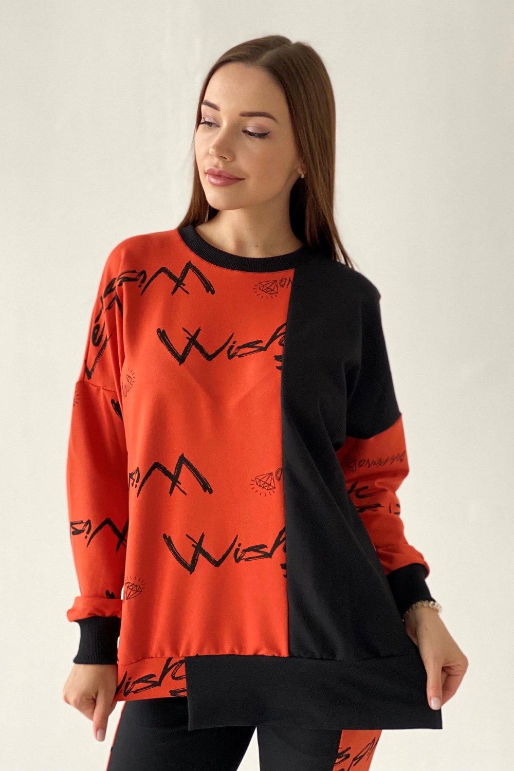 Комплект состоит из свитшота и брюк. Брюки полуприлегающие, на эластичном поясе, с карманами, на эластичном манжете по низу. Вдоль боковых швов расположен лампас из отделочного полотна. Свитшот свободный, с фигурным низом спереди. В нижней части боковых швов обработаны разрезы. Рукав длинный, на эластичном манжете. Горловина округлая, обработана эластичной обтачкой.