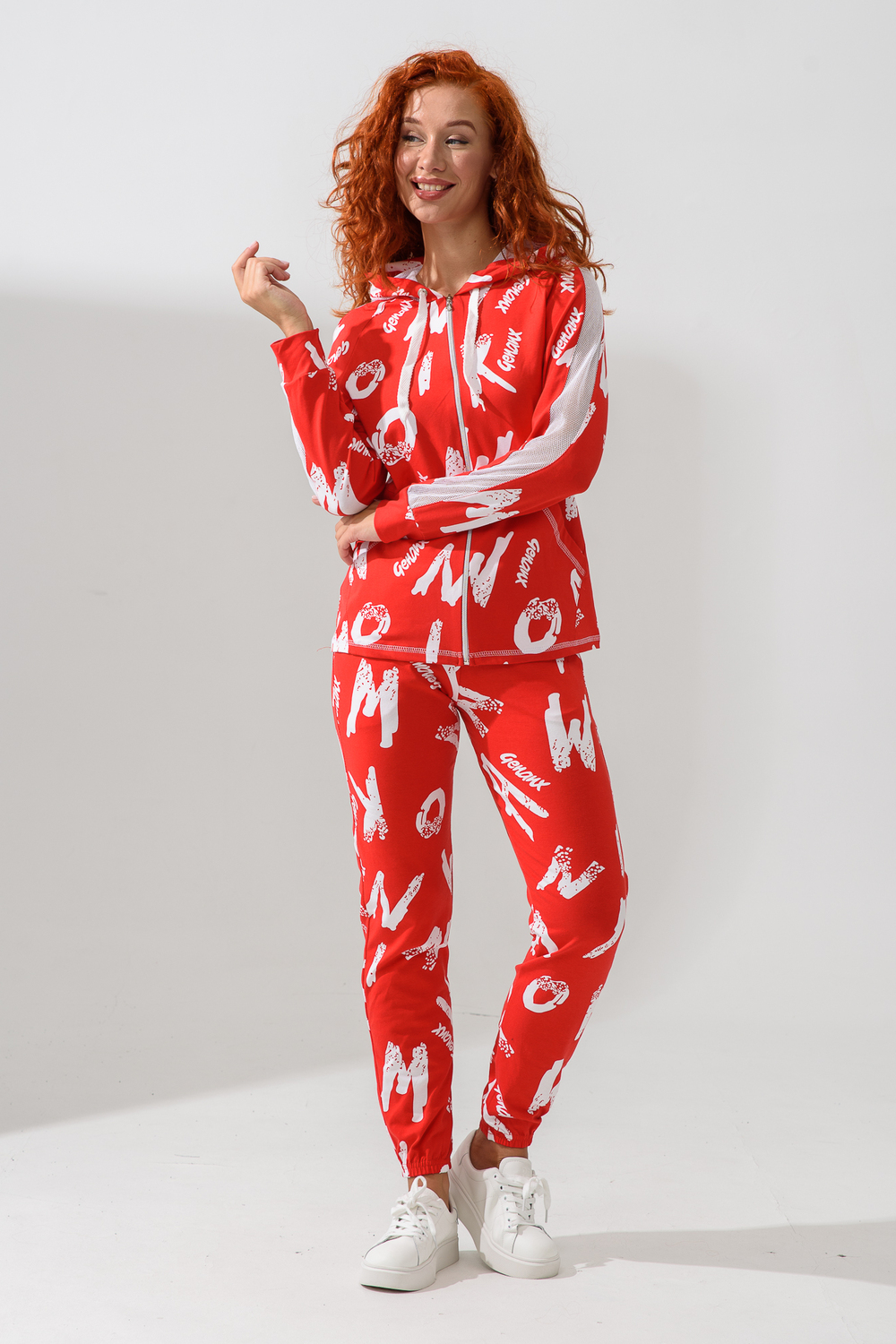 Костюм состоит из толстовки и брюк. Брюки на поясе, с боковыми карманами, на резинке по низу. Толстовка прямая, на молнии, с капюшоном из сетки, с карманами кенгуру, длиной до середины бедра. Рукав реглан, длинный, с лампасами из сетки вдоль рукава, на манжете.