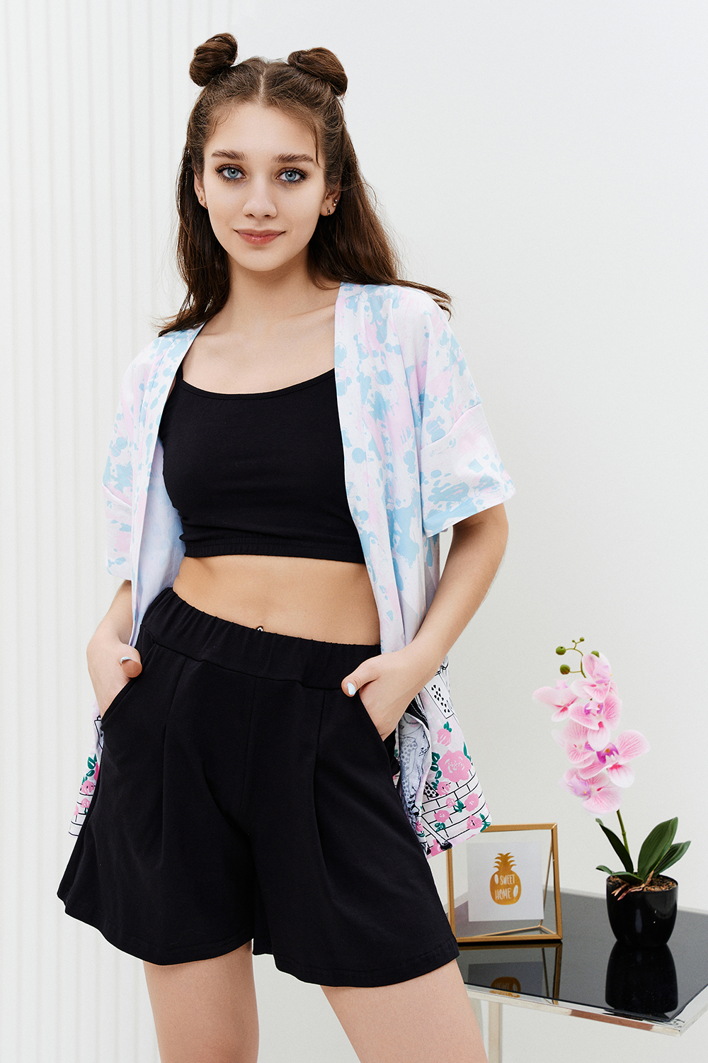 Комплект состоит из топа, шорт и короткого кимоно. Топ из эластичного полотна, на тонких бретелях, длиной выше линии талии, с резинкой по низу. Горловина и бретели топа обработаны бейкой из основного полотна. Шорты из кулирки с лайкрой на поясе, с боковыми карманами. В верхней части передних половинок по шву притачивания пояса расположены складки. Кимоно выполнено из отделочного полотна из кулирки, полуприлегающего силуэта, длиной до середины бедра, с коротким рукавом. Горловина обработана обтачкой.