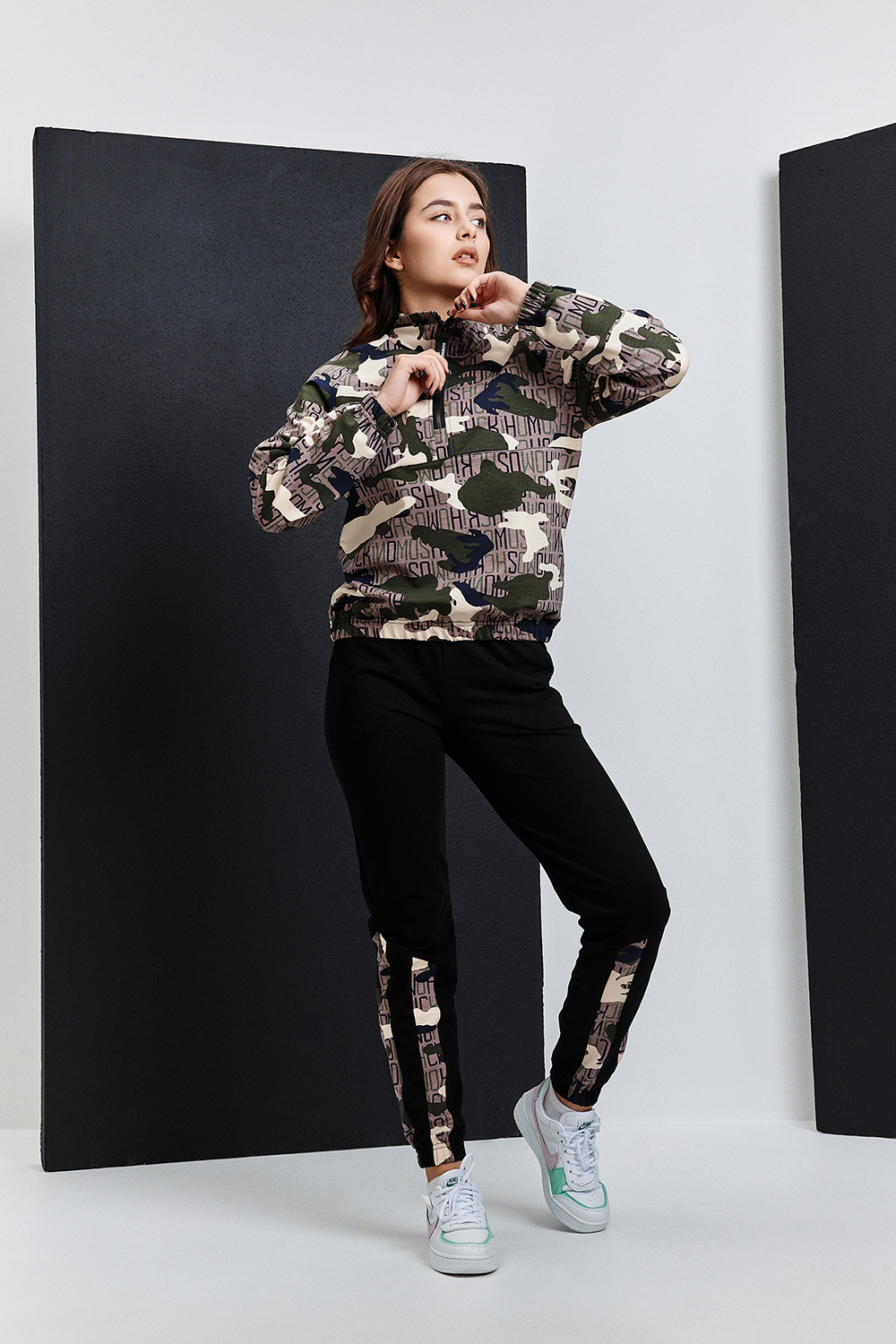 Костюм состоит из толстовки и брюк. Толстовка, с воротником, с молнией до середины полочки, низ собран на резинку. Рукав реглан, длинный, низ на резинке. Брюки, на поясе, с боковыми карманами, с резинкой по низу. В нижней части брюк расположены вставки из отделочного полотна.