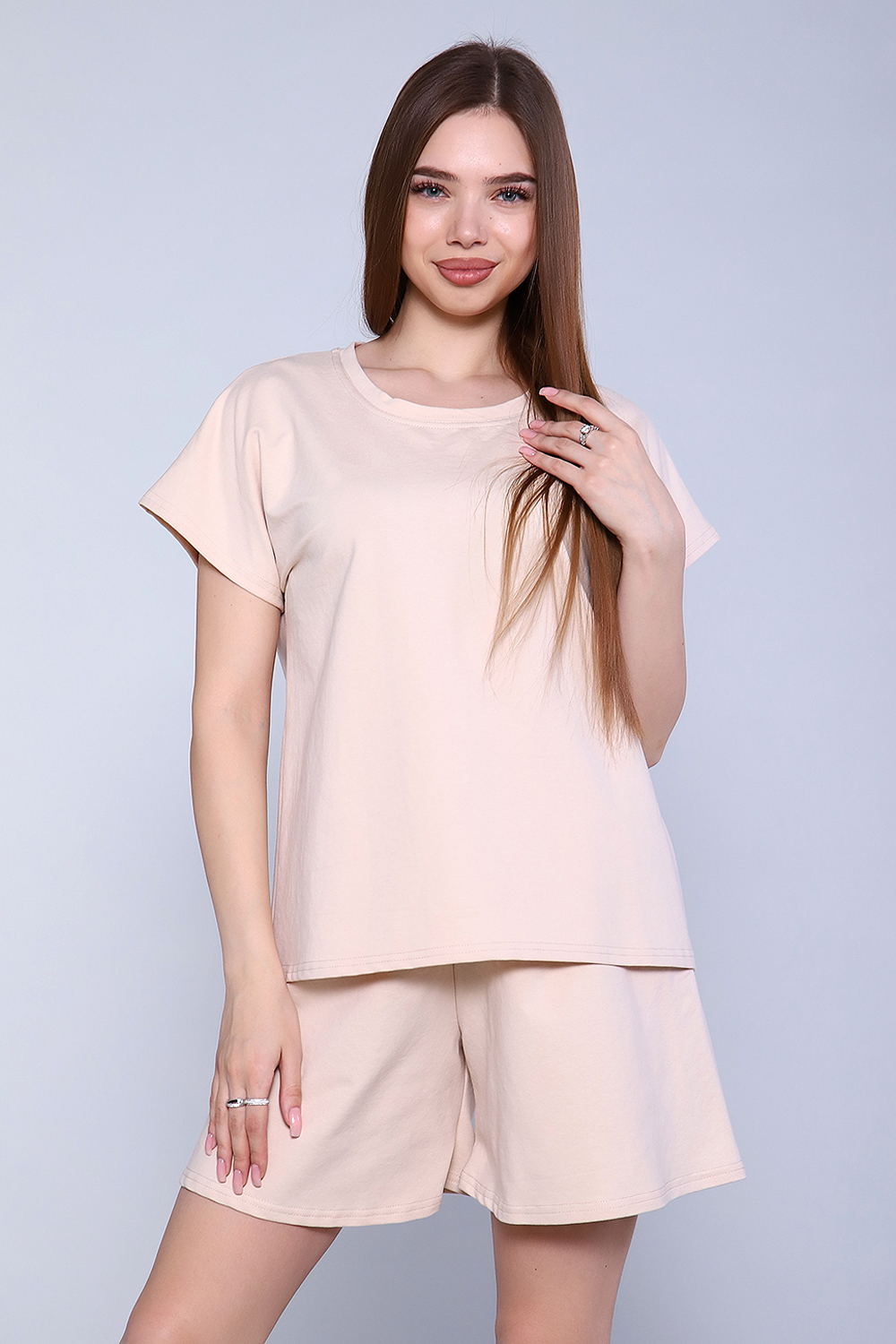 Женский летний костюм с футболкой и шортами. Рукав на футболке спущенный. Пояс шорт обработан на поясной машине. Костюм свободного кроя. Такой костюмчик подойдет для активных прогулок на свежем воздухе, будет незаменим в поездках или в отпуске на море. Отлично впишется в любой гардероб и создадут современный стильный образ на каждый день.