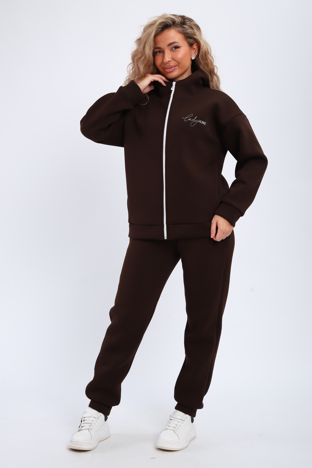 Женский костюм из футера 3-х нитки с начесом. Костюм состоит из толстовки и брюк. Толстовка свободная на молнии с капюшоном, на полочке оригинальная вышивка Lady HOME, по боковому шву в шве карман. Толстовка со спущенным рукавом на манжете. Брюки свободные. По боковому шву карман в шве, низ брюк на манжете. Пояс обработан на поясной машине, что делает брюки практичными при носке резинка не скручивается. Костюм теплый, удобный, комфортный. Идеальное решение для повседневной носки в прохладную погоду!