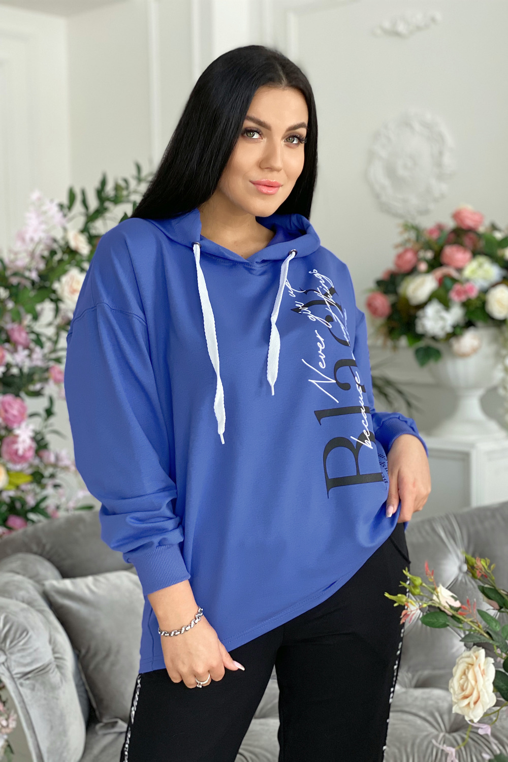Костюм женский прямого силуэта, оверсайз. Толстовка и брюки. Толстовка с капюшоном, линия низа на полочке выше, чем на спинке. Брюки свободные, с внутренними карманами на передней части брюк и один накладной карман на задней половинке, низ брюк на манжете. На полочке и брюках модный принт.