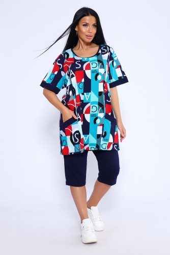 Костюм женский: туника и бриджи. Туника полуприлегающего силуэта с фигурным Y-образным вырезом. Рукав короткий цельнокроенный со швом. На полочке нагрудный карман с пуговицей, из отделочной ткани в полоску. В боковых швах туники и бриджей небольшие разрезы. Бриджи из ткани в полоску, длина ниже колена, на передних частях внутренние карманы, пояс обработан на многоигольной машине. На модели 52 размер