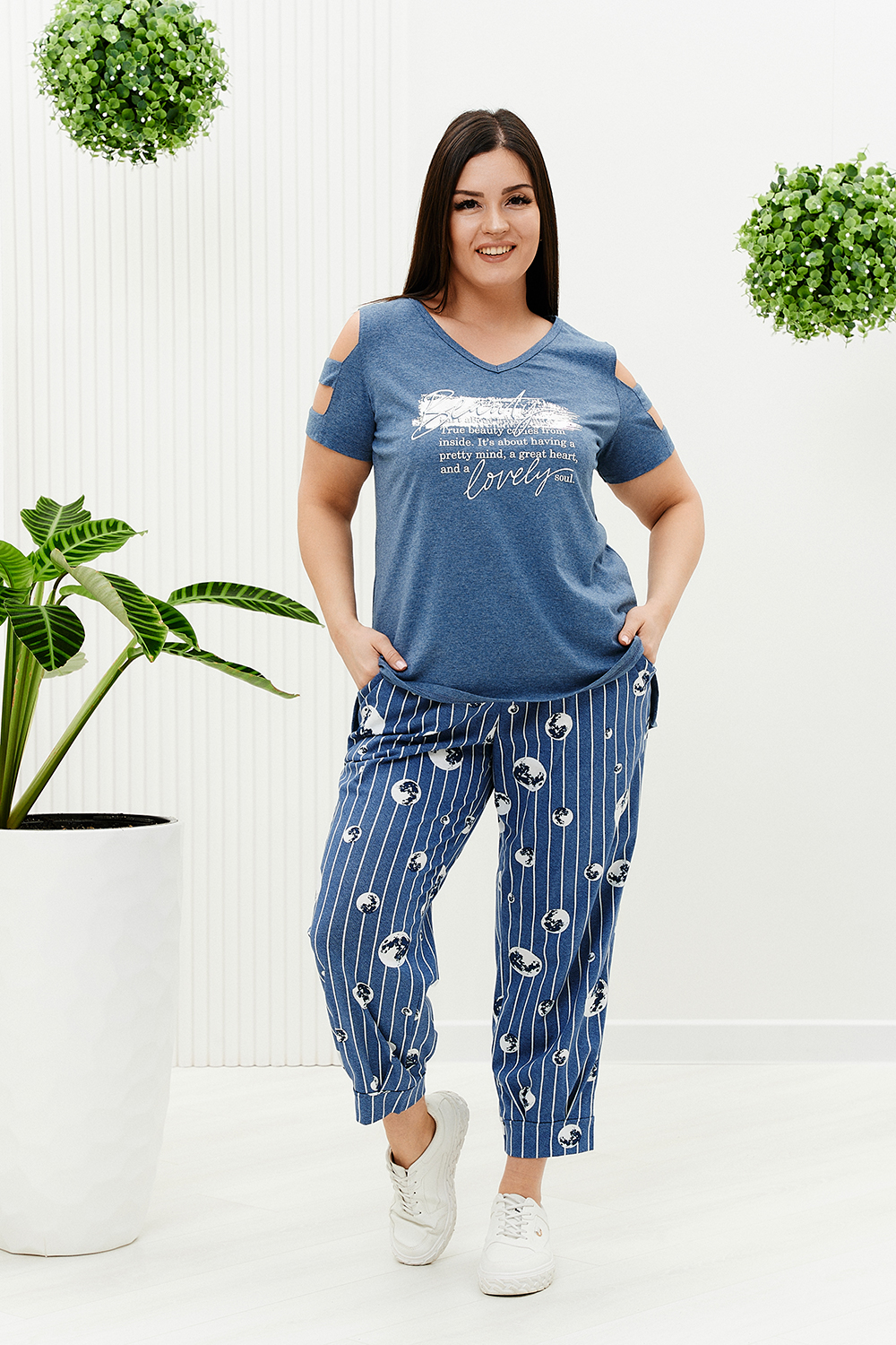 Костюм женский: туника и брюки. Туника прямого силуэта, вырез Y-образный. Полочка несколько короче спинки, сбоку разрезы. На полочке принт. Рукав не цельный, два хляста, расположенные через расстояние друг от друга, втачаны в боковые части рукава. Брюки свободные, бананы, внизу передней и задней части по две встречные складки, манжеты. В брюках удобные внутренние карманы, пояс выполнен на многоигольной машине.