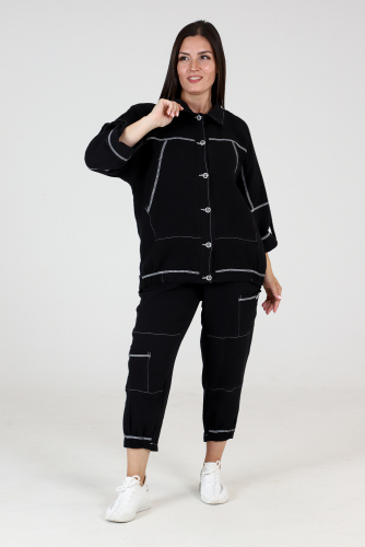 Костюм женский: Куртка и брюки. Куртка прямого силуэта, воротник втачной, на полочке кокетка и накладной карман типа кенгуру, застежка на планке на петли - пуговицы (петли с глазком). Рукав цельнокроенный со швом с манжетой и хлястом. Внизу полочки пояс, сбоку пояса резинка. На спинке кокетка, по центру декоративная складка с двумя пуговицами. Внизу бокового две декоративные паты с пуговицами. Брюки свободные по бедрам, внизу передние половинки брюк собраны на резинку. Передняя часть брюк состоит из трех частей. В верхней части внутренние накладные карманы. Накладной карман на верхней левой и средней правой частях брюк. Пояс выполнен на многоигольной машине.