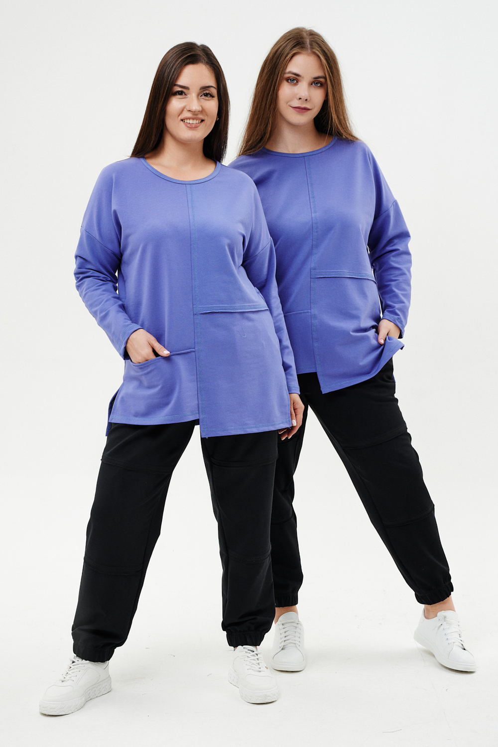 Костюм женский: туника и брюки. Туника прямого силуэта, горловина круглая, рукав длинный, цельнокроеный со швом., состоит из передней и задней частей. Полочка из четырех частей: на правой части внутренний горизонтальный карман в шве, на левой горизонтальный шов с открытыми срезами, аналогичный шов на спинке и на передней части брюк. В боковых швах разрезы. Брюки свободные по бедрам, зауженные к низу, на передней части брюк внутренние карманы. Пояс выполнен на многоигольной машине.