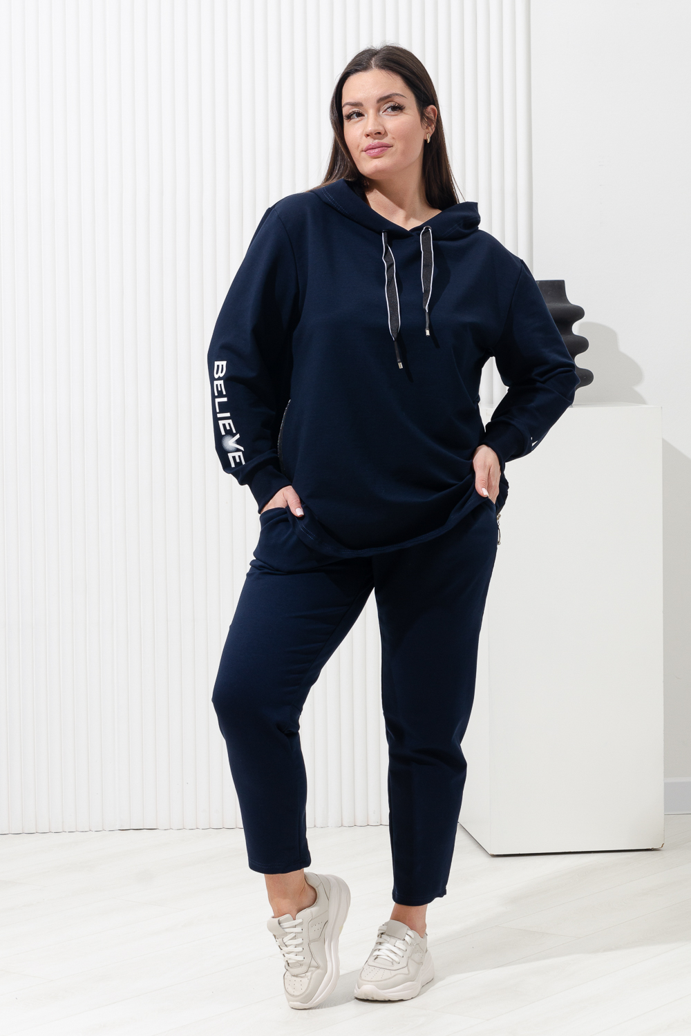 Костюм женский: толстовка и брюки. Брюки женские, свободные по бедрам, зауженные к низу. На передних частях брюк внутренние карманы. На задних частях брюк фигурные рельефы, переходящие в боковой шов. Толстовка прямого силуэта с капюшоном. Рукав спущенный. Низ толстовки фигурный, сбоку стильные молнии, при расстегивании образуют разрезы. На рукавах модный принт.