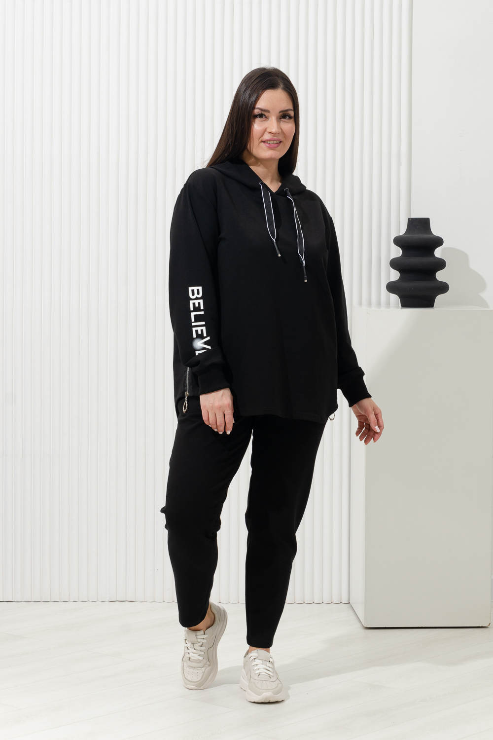 Костюм женский: толстовка и брюки. Брюки женские, свободные по бедрам, зауженные к низу. На передних частях брюк внутренние карманы. На задних частях брюк фигурные рельефы, переходящие в боковой шов. Толстовка прямого силуэта с капюшоном. Рукав спущенный. Низ толстовки фигурный, сбоку стильные молнии, при расстегивании образуют разрезы. На рукавах модный принт.