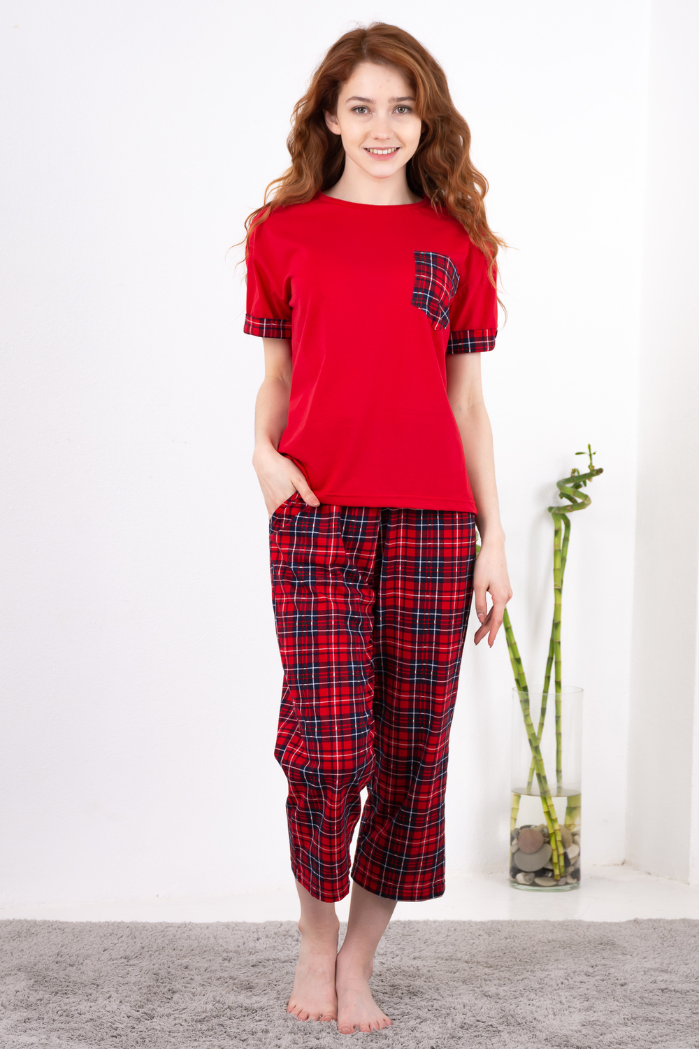 Отличный вариант для дачи, дома и летнего отдыха. Очень свободный крой. Футболка со спущенной линией плеча. На груди накладной карман, по низу рукавов манжеты. Свободные удлиненные бриджи, в боковых швах карманы.