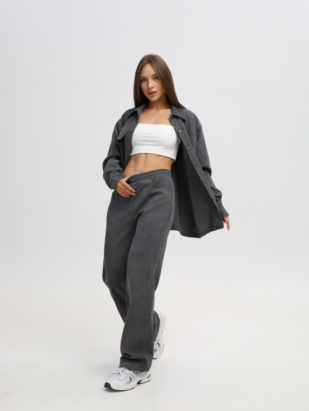 Спортивный женский костюм выполнен из мягкого вельветового материала, который придает ему модный и элегантный вид. Костюм для женщин состоит из рубашки оверсайз и брюк прямого кроя, создающих гармоничный и современный образ. Однотонный оттенок делает его универсальным для разных случаев от повседневных прогулок до офисного или делового стиля. Рубашка свободного фасона с длинными рукавами украшена классическим воротником и застегивается на пуговицы. Вельвет обладает приятной текстурой, которая сохраняет комфорт даже при длительном ношении. Брюки имеют удобные карманы, прямой силуэт, что делает их подходящими для девушек и женщин разных возрастов. Эластичный пояс обеспечивает удобную посадку, а продуманная длина визуально вытягивает силуэт. Удобная и трендовая одежда в современном стиле, которая дополнит базовые и спортивные образы или молодежный лук в стиле casual (кэжуал). Нарядный костюм отлично подойдет как для осенних прохладных дней, так и для создания стильных летних образов. Женский костюм-двойка отличается универсальностью благодаря сочетанию комфорта и модного дизайна. Он может использоваться как спортивный наряд для активного отдыха или домашний вариант для уюта в холодное время года. Актуальный oversize крой подчеркивает современные тенденции в мире моды.
