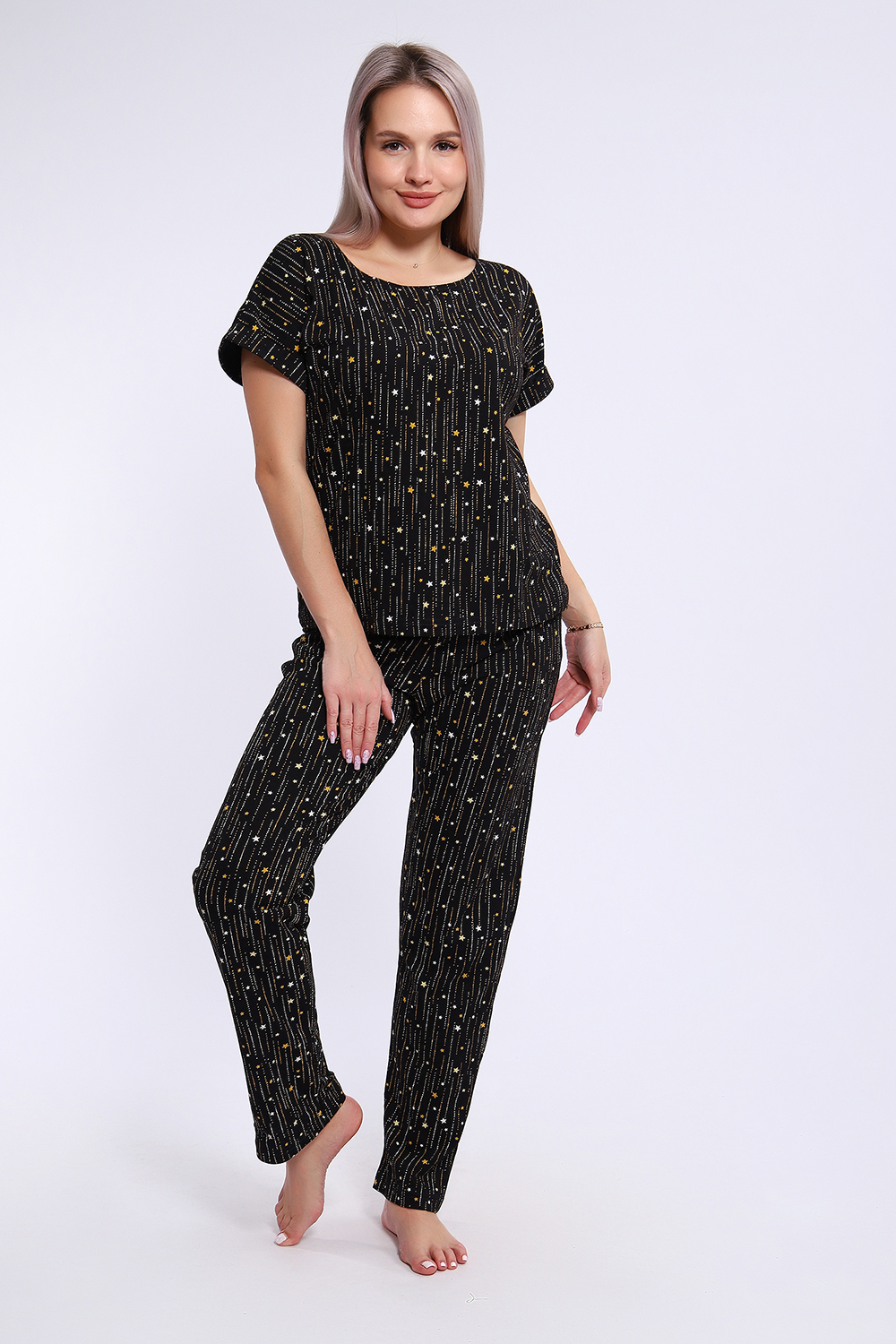 Костюм с брюками выполнен из хлопкового трикотажного полотна, мягкий на ощупь и приятный к телу. Футболка с цельнокроеным рукавом свободно облегает фигуру, скрывая недостатки, создавая изящный силуэт при любых параметрах фигуры. Брюки со средней высотой посадки на притачной эластичной тесьме по талии. Пижамный костюм с брюками с легкостью применим в качестве домашней одежды.