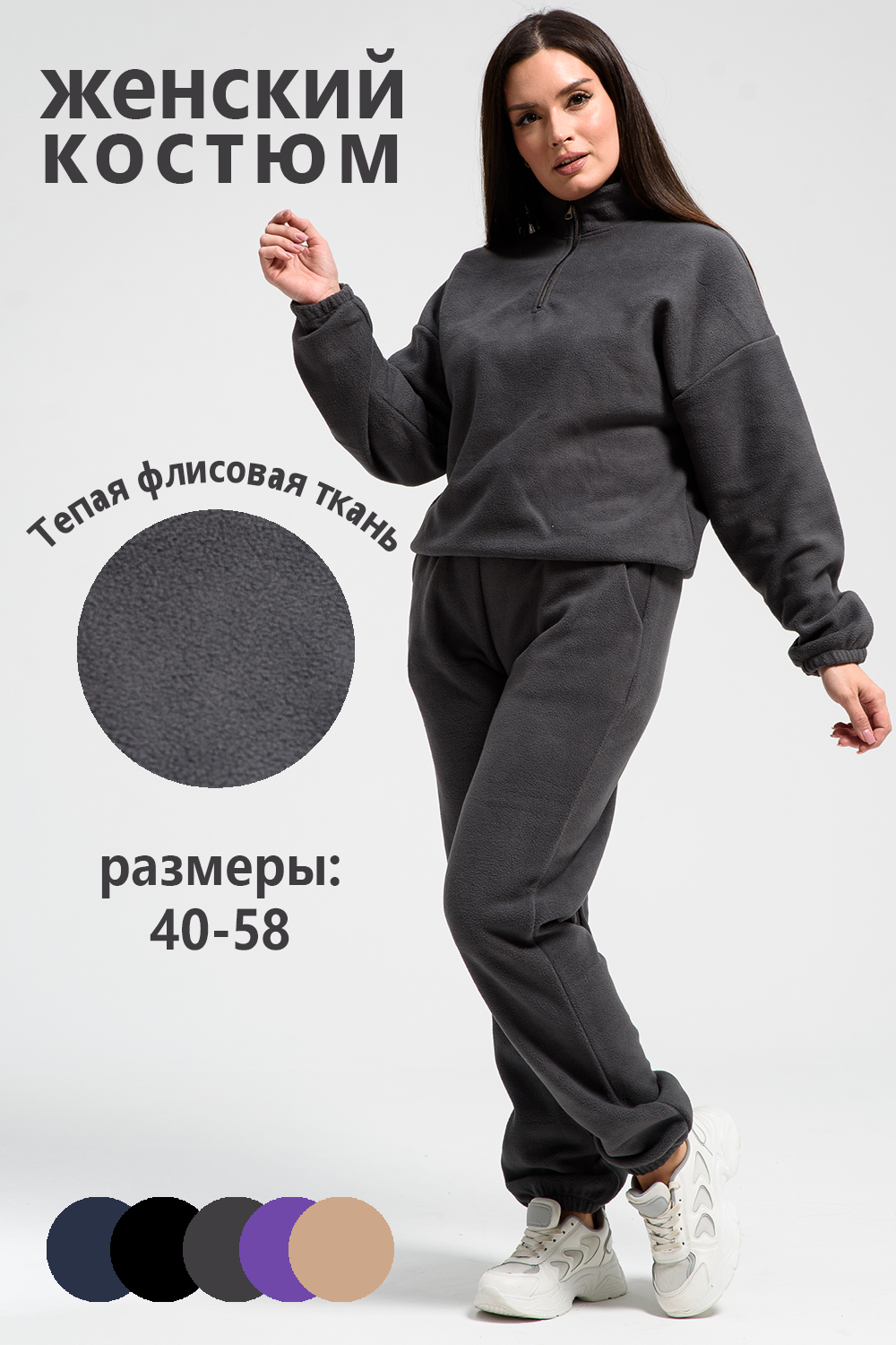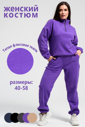 Женский спортивный костюм из теплой ткани - флис, прекрасный выбор на прохладную погоду, Верх - толстовка с горлом-стойкой и короткой молнией, понизу и на манжетах резинка, низ - брюки с карманами, пояс и низ штанов на резинке. Двойка подойдет для прогулок и дома.