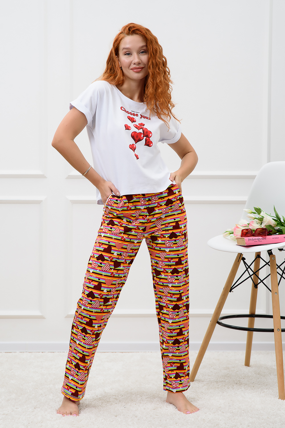 Костюм женский домашний с широкими брюками и свободной футболкой с ярким принтом.