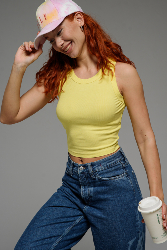 Майка облегающая, средней длины, с округлой горловиной. Размер регулируется за счет эластичности полотна. Бретели выполнены из эластичной тесьмы с надписями. Горловина и проймы обработаны бейкой из основного полотна.