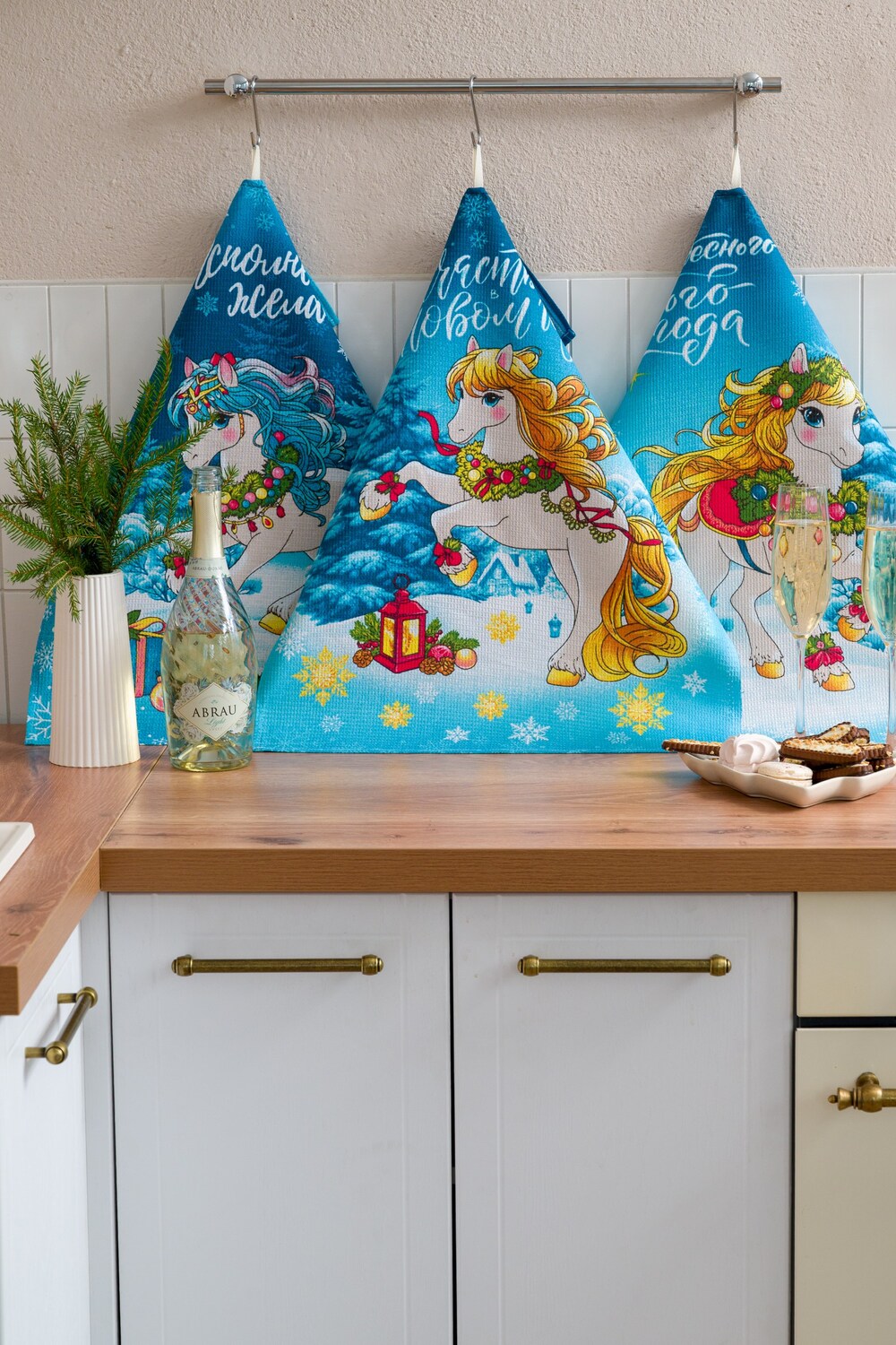 Набор кухонных полотенец Сивка-бурка отличный подарок на Новый год для близких. В наборе 3 полотенца размером 60*48 с петелькой. Выполненные из высококачественного вафельного полотна полотенца очень удобны в быту, отлично впитывают влагу и не требуют особого ухода. Принт символа 2026 года никого не оставит равнодушным, милые лошадки подарят уют на кухне и хорошее настроение Набор представлен в двух расцветах серый и голубой.