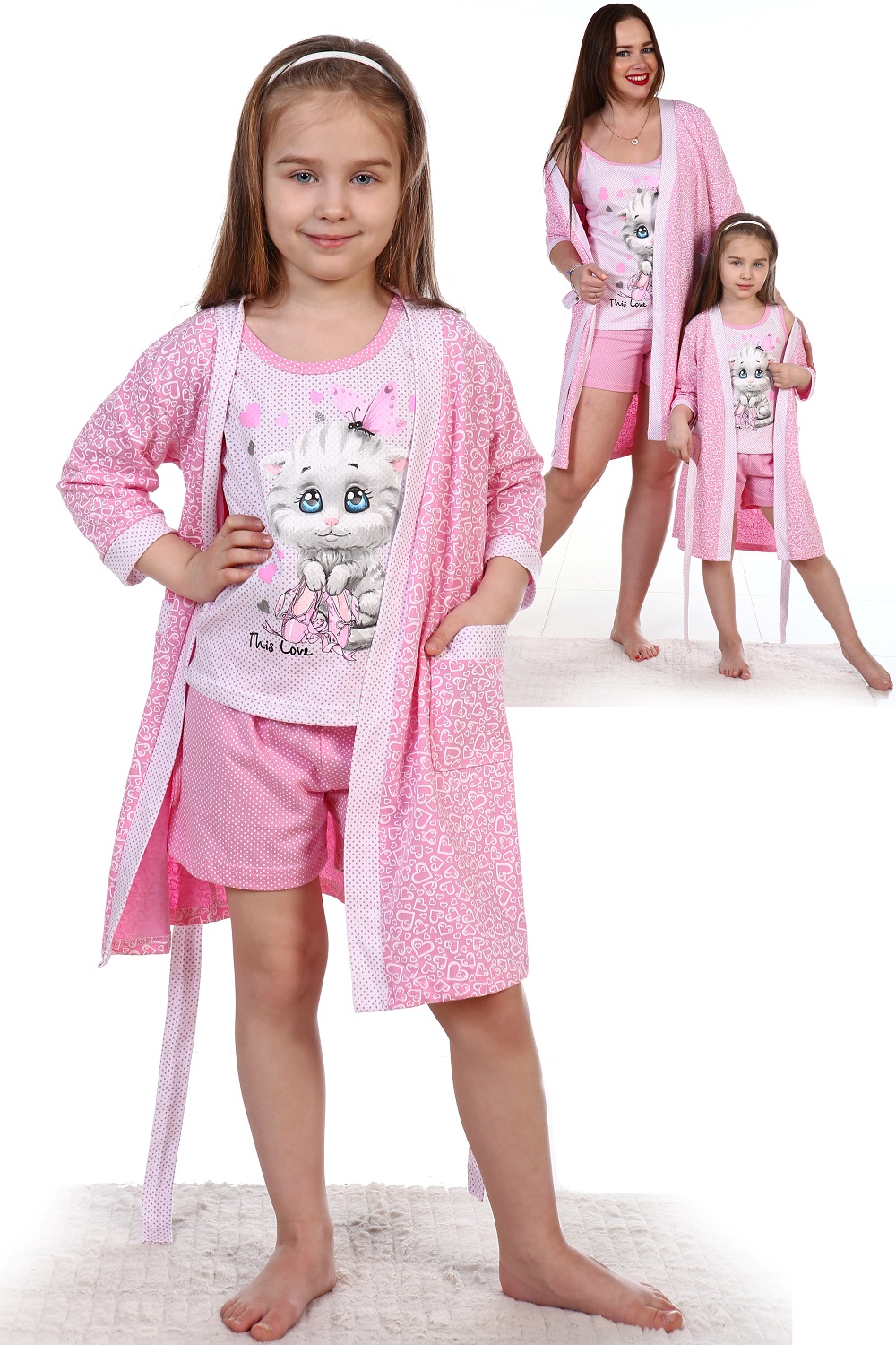 Пеньюар из кулирки для девочек из кулирки халат + майка + шорты. Халат запашной с поясом, узор в сердечко, светлые манжеты и лацканы в крапинку, длина чуть выше коленей. Светлая майка с принтом в виде котенка, узор в крапинку, окантовка в тон халата. Короткие шорты в крапинку. Несколько вариантов расцветки. Может быть парой женскому пеньюару Шоколад (продается отдельно). Размеры от 30 до 40.