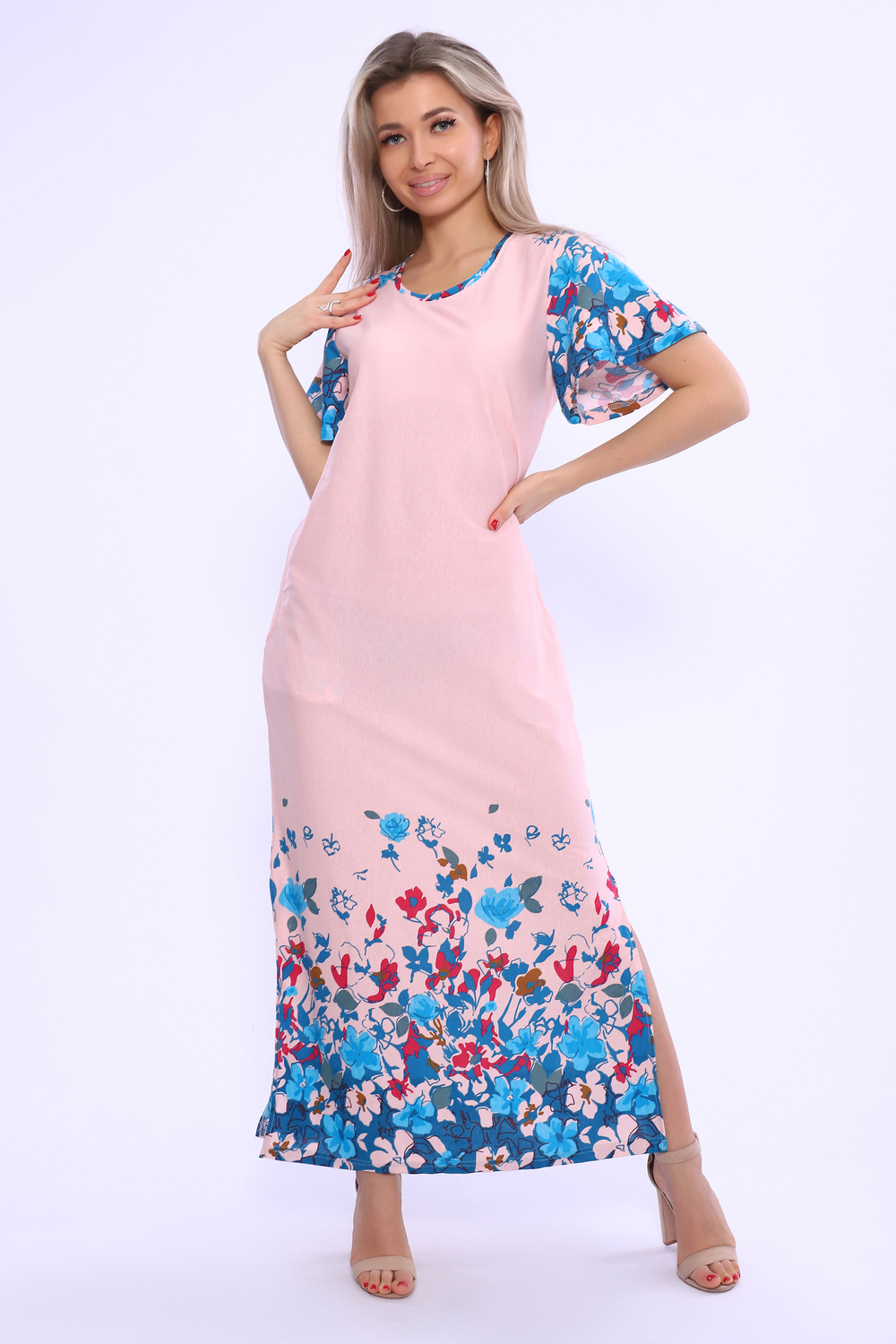 Платье полуприлегающего силуэта с короткими рукавами - крылышками. В боковых швах разрезы и карманы. Идеально для повседневной носки.
