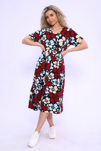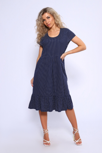 Платье свободного кроя с асимметричной сборкой на юбке, короткими рукавами и удобными карманами в боковых швах.