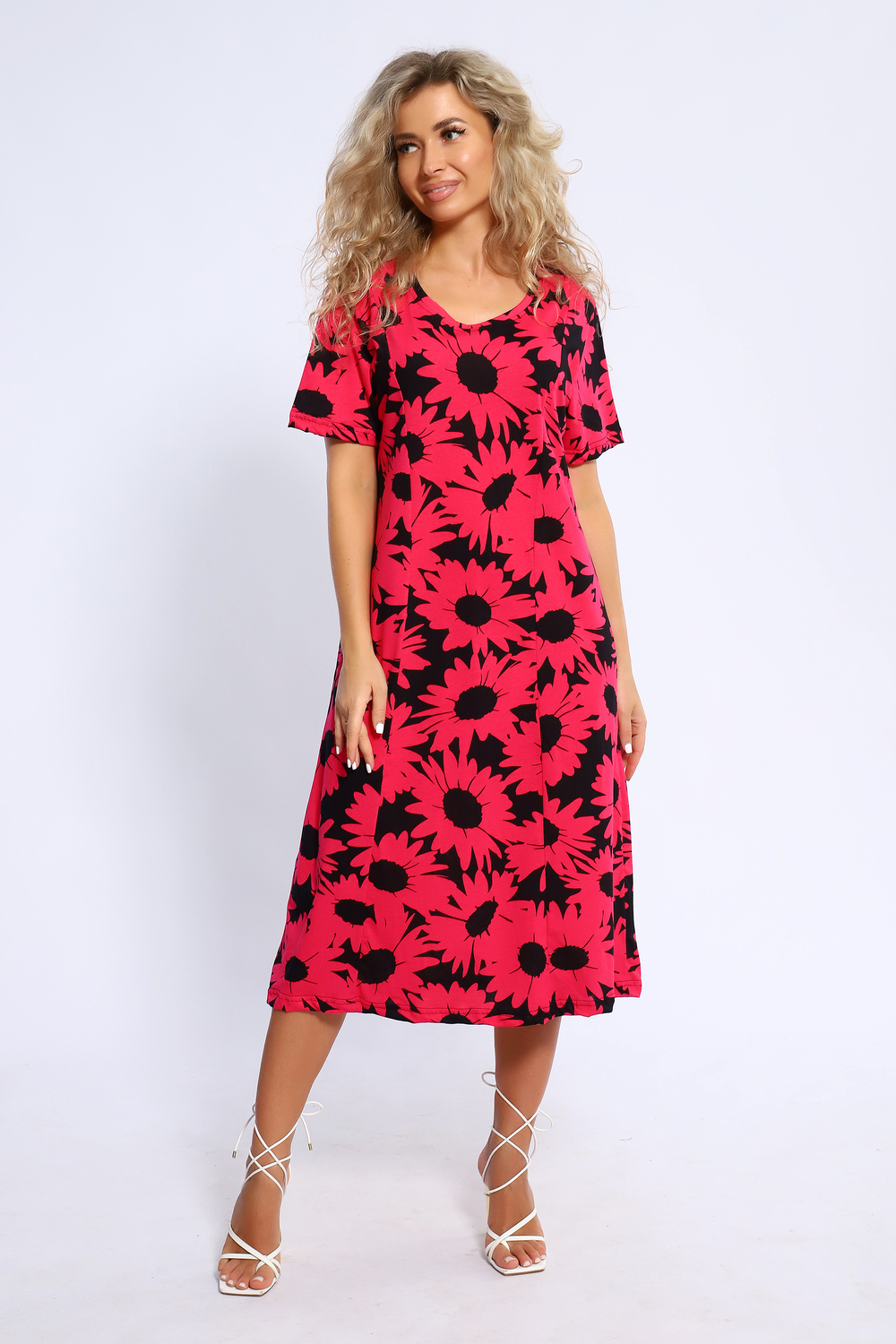 Платье с круглым вырезом горловины, немного приталенное, к низу расклешенное. Карманы в боковых швах.