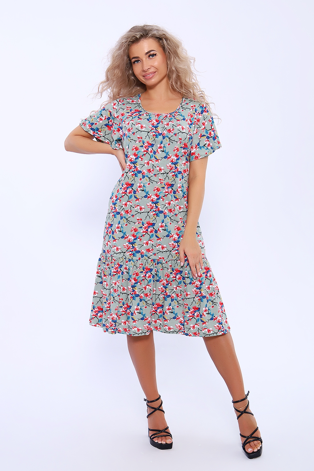 Платье полуприлегающего силуэта с короткими расклешенными рукавами. По центру горловины сборка. В боковых швах удобные карманы. По низу изделия волан на сборке.