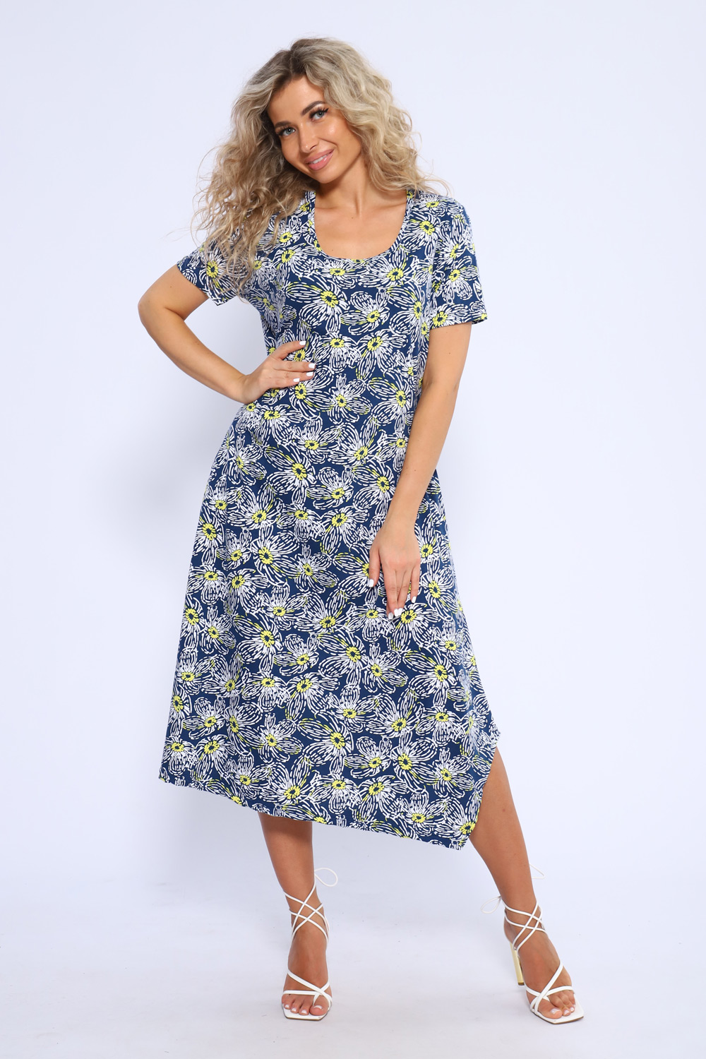Платье женское из натуральной хлопковой кулирки, удлиненное с фигурными вырезами в нижней части бобковых швов. Рукава вшивные короткие, есть боковые карманы. Восхитительный рисунок на ткани в виде контурных ромашек.
