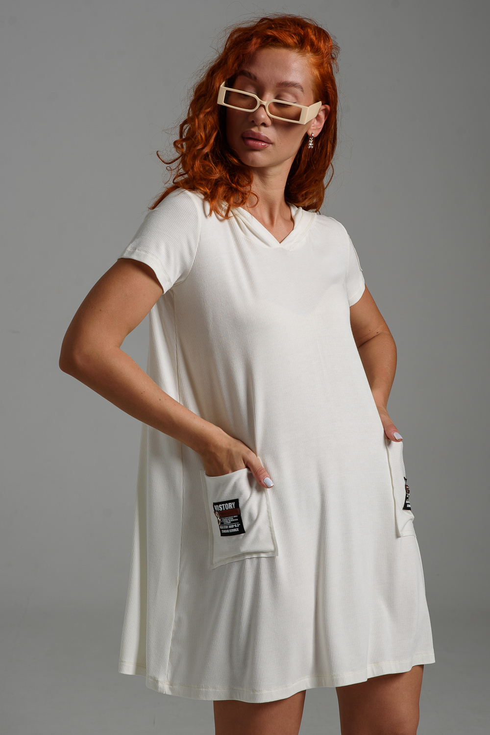 Летнее спортивное мини, легкое с короткими рукавами и капюшоном. Выполнено из мягкой, эластичной, приятной к телу ткани. Платье свободного кроя с накладными кармашками на полочке и рукаве - дополненными декоративными шевронами. Это модная и стильная вещь идеально подойдет, как для дома, так и для летних прогулок на отдыхе в отпуске. Платье легко сочетается с различной обувью будь это - кеды, кроссовки, босоножке, сабо, что позволяет вам создавать различные образы.