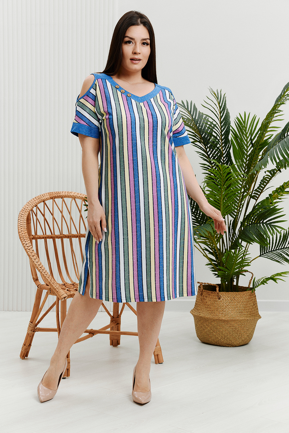 Платье женское с V-образным вырезом, рукава с открытым плечом, по низу рукавов планка, по низу изделия разрезы.