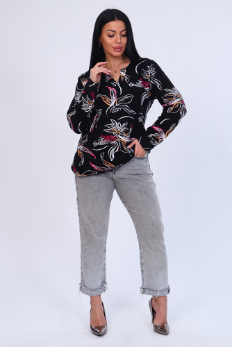 Платье с оригинальным принтом из мягкого футера с лайкрой 2-х нитка. Модель свободного силуэта, горловина круглая, воротник-стойка, спущенная пройма, длинный рукав на манжете, в боковых швах удобные карманы, внизу по бокам разрезы, спинка чуть длиннее переда. По плечевому шву и по пройме рукава декоративная строчка из люрекса, гармонично сочетается с принтом на груди. Стильное, уютное платье отличный офисный вариант для современной, деловой модницы.