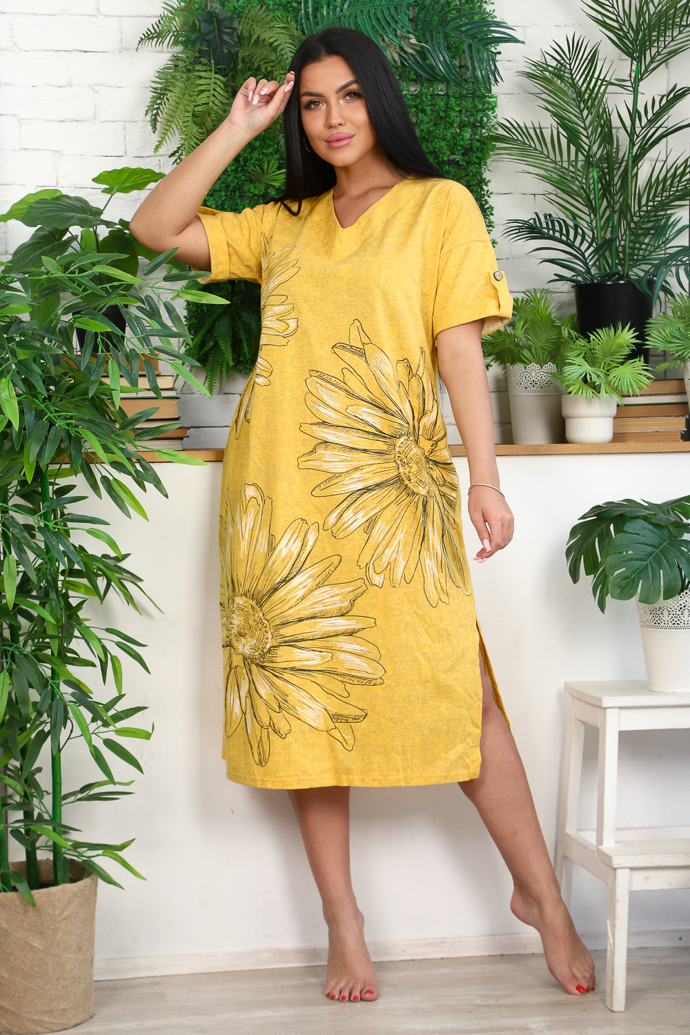 Платье прямого силуэта, с V-образной горловиной спереди и сзади, с карманами, с разрезами в нижней части боковых швов. Рукав короткий, с отложным манжетом и хлястом с пуговицей. Вход в карман обработан бейкой из основного полотна.