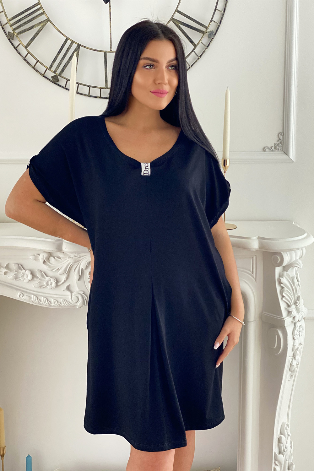 Платье женское прямого силуэта. Рукав цельнокроенный короткий. Середина горловины полочки и низ рукава слегка собран на декоративную серебряную тесьму. От линии талии по центру полочки встречная складка. В боковых швах изделия есть карманы.
