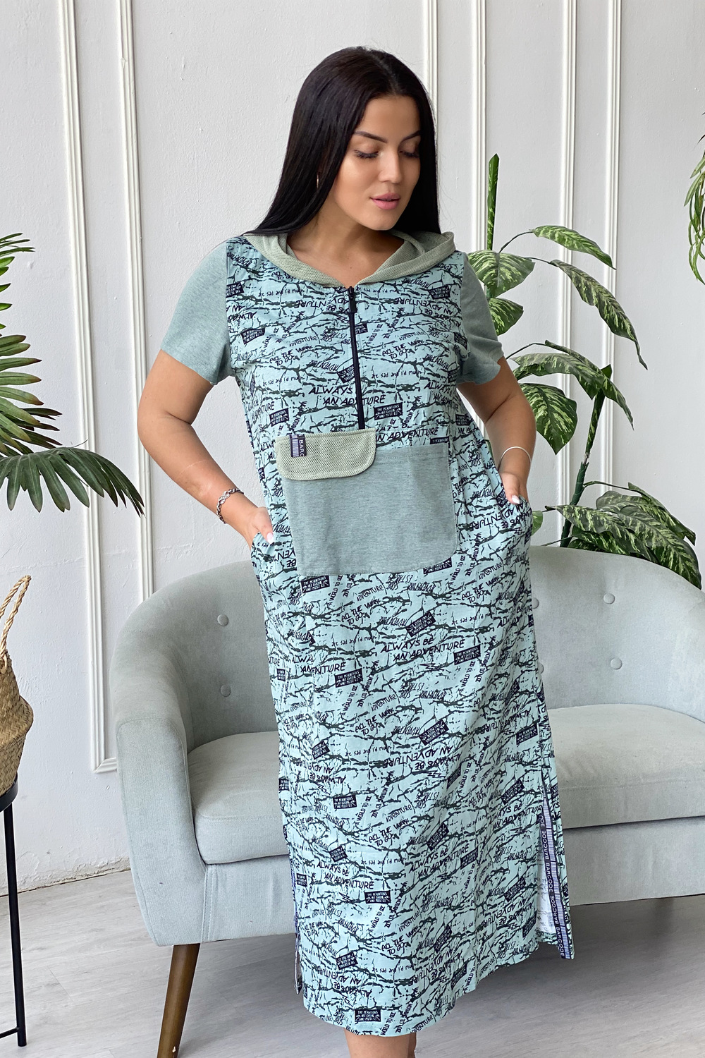 Платье женское прямого силуэта. Рукав втачной короткий. Верхняя часть полочки застежка на тесьму молнию. В нижней части полочки широкий накладной карман с клапаном. Капюшон и клапан из х/б сетки. В боковом шве внутренние карманы и разрезы с декоративной тесьмой. Цвет сетки капюшона может быть черного или зеленого цвета.