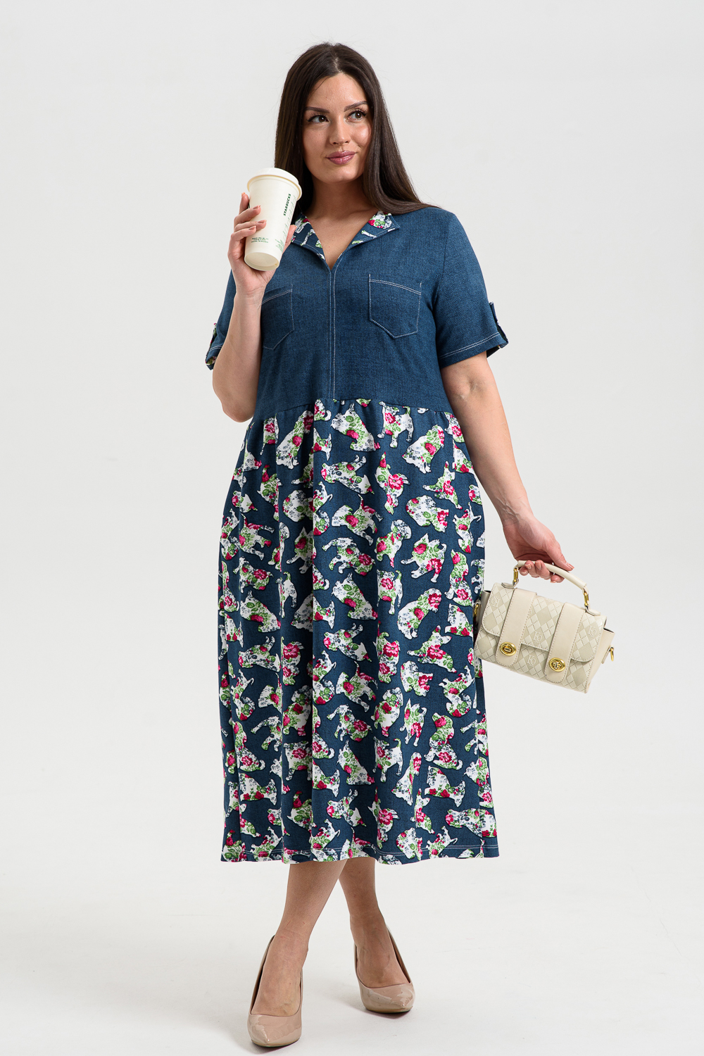 Фасон платья позволяет легко скрыть недостатки фигуры и при этом элегантно выглядеть! Платье отрезное по линии талии, с боковыми карманами, длиной ниже колена, юбка из отделочного полотна со сборкой по линии талии. Полочка с V-образной горловиной и отложным воротником, с накладными карманами. Спинка с кокеткой и вертикальными рельефами. Рукав втачной, короткий, с патой и пуговицей. Горловина спинки обработана бейкой из основного полотна.