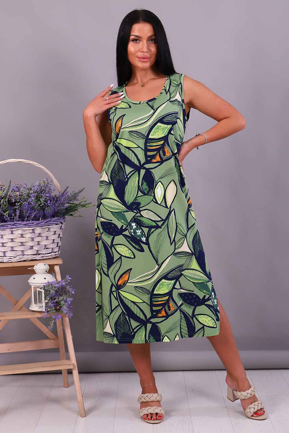 Женское платье-сарафан прямого силуэта из трикотажного полотна (100% хлопок). Горловина и пройма отделана окантовочной беей в цвет изделия. Внизу по боковым швам разрезы. Длина изделия ниже колена. Удобный сарафан, приятный к телу, не стесняет движения, подойдет беременным. Яркие стойкие цвета ткани. Большие размеры широкий размерный ряд 44-62. Для дома и дачи, для отдыха и прогулок, в отпуск, на море.