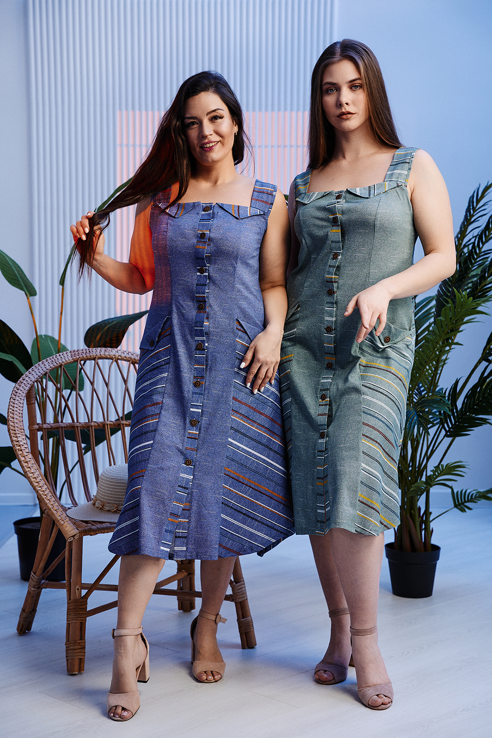 Сарафан женский полуприлегающего силуэта, к низу слегка расклешенный. На полочке и спинке рельефы. Застежка на петли - пуговицы, планка. Передние бретели, боковые части полочки и спинки, верхние декоративные клапана полочки из ткани в полоску, что придает изделию особую неповторимость.