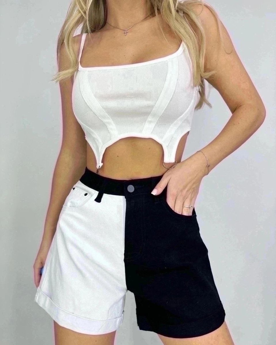 Двухцветные джинсовые шорты, отличаются оригинальностью. Сочетание белого и черного цветов отличают их от обычных шорт. Высокая посадка и отличное кчество подарят комфорт во время прогулок.