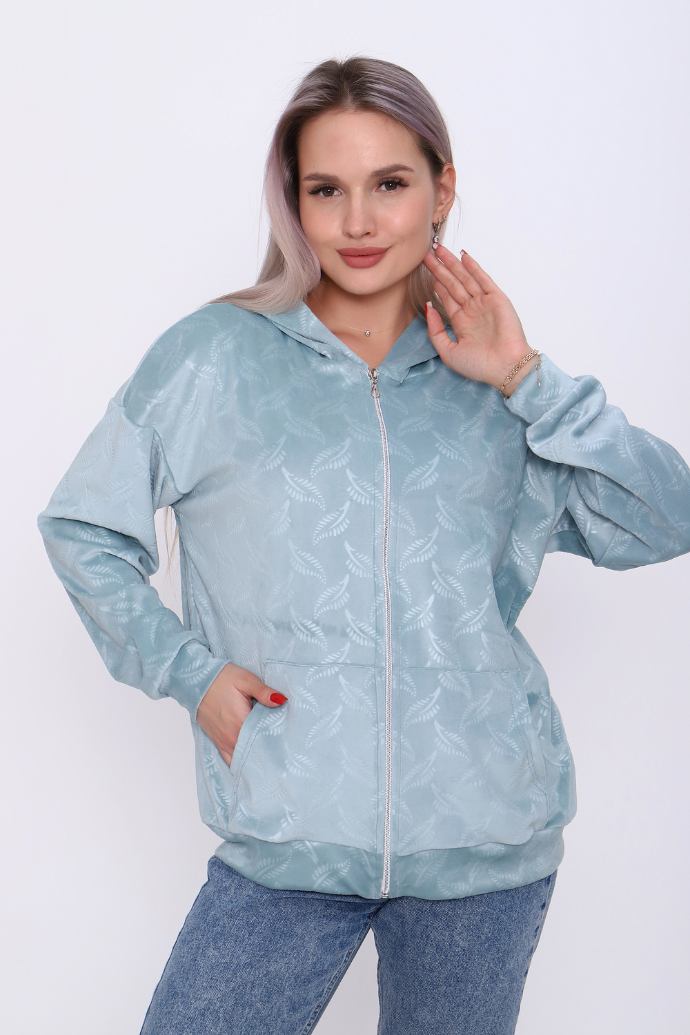 Толстовка женская оверсайз, застегивается на длинную молнию, выполнена из велюра с теснением. Толстовка застегивается на молнию, боковые глубокие карманы и несъемный капюшон. Толстовка теплая женская с капюшоном выполнена из мягкого, нежного и приятного трикотажного полотна, имеет свободный крой оверсайз, благодаря чему прекрасно подойдет как для стройных и худеньких девочек или девушек, так и для полных и высоких женщин. Худи женская на молнии - это удобный повседневный вариант верхней одежды в качестве кофты для дома. Можно сочетать с джинсами, брюками, штанами, спортивными брюками, леггинсами и юбками. Женская толстовка идеальна для дома, улицы, прогулок, занятия спортом на свежем воздухе и походов - вещь абсолютно необходимая. Подойдет для девушек и женщин с разным типом фигуры. Замечательный подарок маме, дочери, сестре, бабушке, коллеге или подруге на праздничный день.