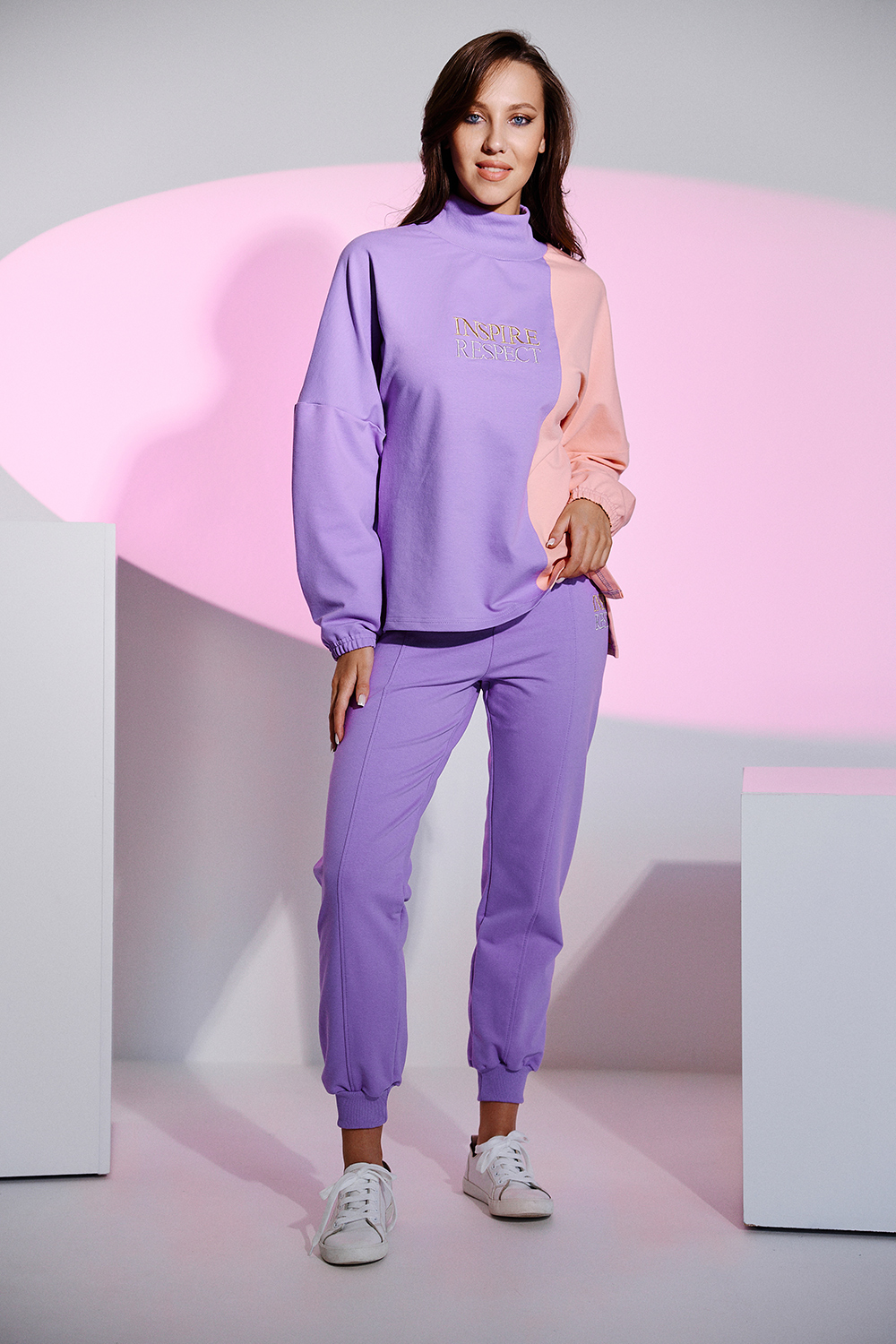 Свитшот женский, модель свободная из контрастных тканей, прямого силуэта. Горловина выполнена из кашкорсе. Рукав со спущенной проймой, манжета на резинке.