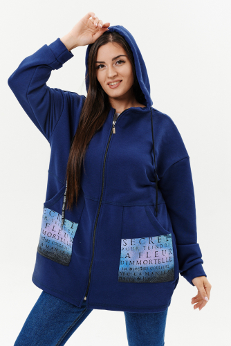 Толстовка женская прямого силуэта до линии бедер, в нижней части заужена по бокам. Рукав втачной с заниженной линией плеча, с манжетой. Капюшон с люверсами и декоративными шнурками с надписью. Застежка на тесьму-молнию. В нижней части полочки два накладных кармана со стильным принтом. Материал - футер 3-х нитка петля.