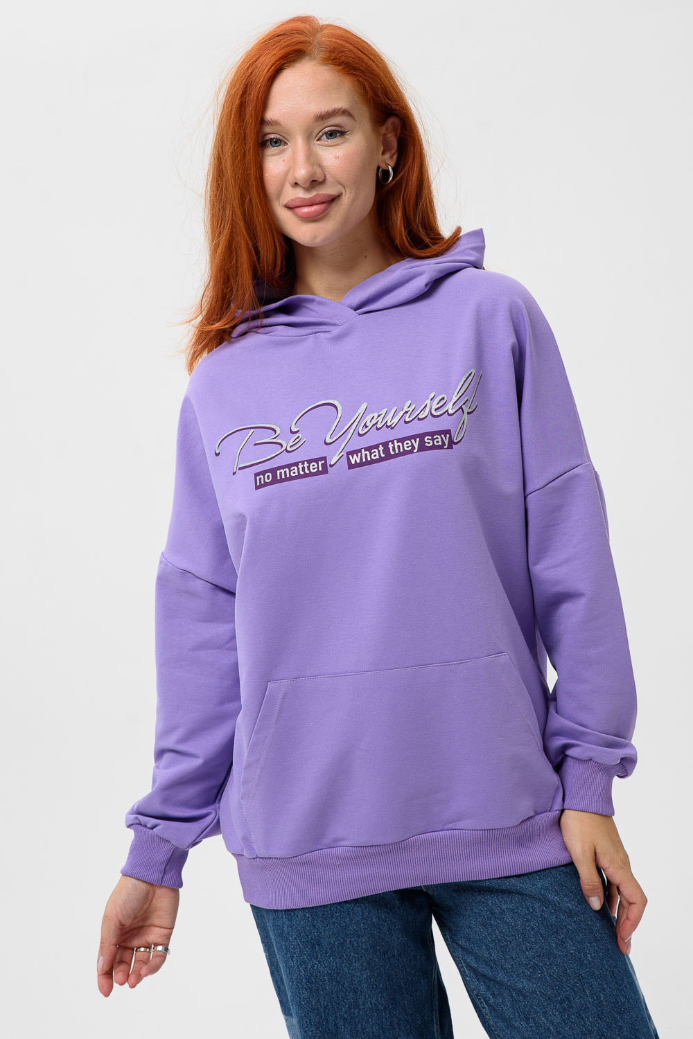 Фиолетовая мода. Слегка удлинённая толстовка в спортивном стиле с карманом кенгуру и капюшоном. Изделие выполнено из футера без начёса. Перевод текста:Будь самим собой и не важно что о тебе говорят. Линия плеча спущена, рукава удлинённые. В измерениях длина рукава указана от шва втачивания капюшона. Манжеты и низ толстовки обработаны плотной резинкой кашкорсе.