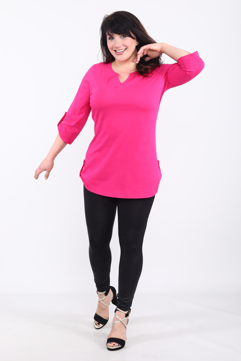 Туника женская с рукавом 3/4. Данная модель выполнена из трикотажного полотна кулирка (хлопок 100%). Горловина обработана обтачкой. Низ изделия округлый. По бокам изделия и внизу на рукавах присутствуют хлястики с пуговками. Отличная модель для отдыха и прогулок.