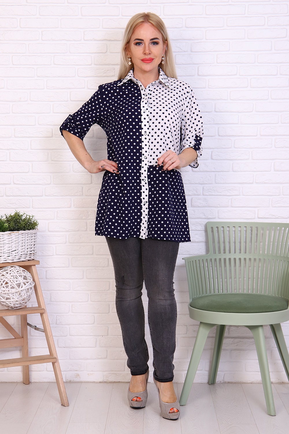 Женская туника рубашечного кроя из легкой ткани. Сочетание двух цветов гороха придает ей загадочность и элегантность.