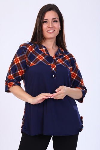 Повседневная, женская, туника свободного силуэта из набивного трикотажного полотна (штапель). Горловина круглая с отложным воротником. Спинка изделия, чуть длиннее полочки, низ изделия закруглен. На полочке рубашки расположен накладной нагрудный карман. Рукава укороченные, низ рукавов подобран на пату. Спинка цельнокроеная. Низ туники фигурный. Туника застегивается на пуговицы.