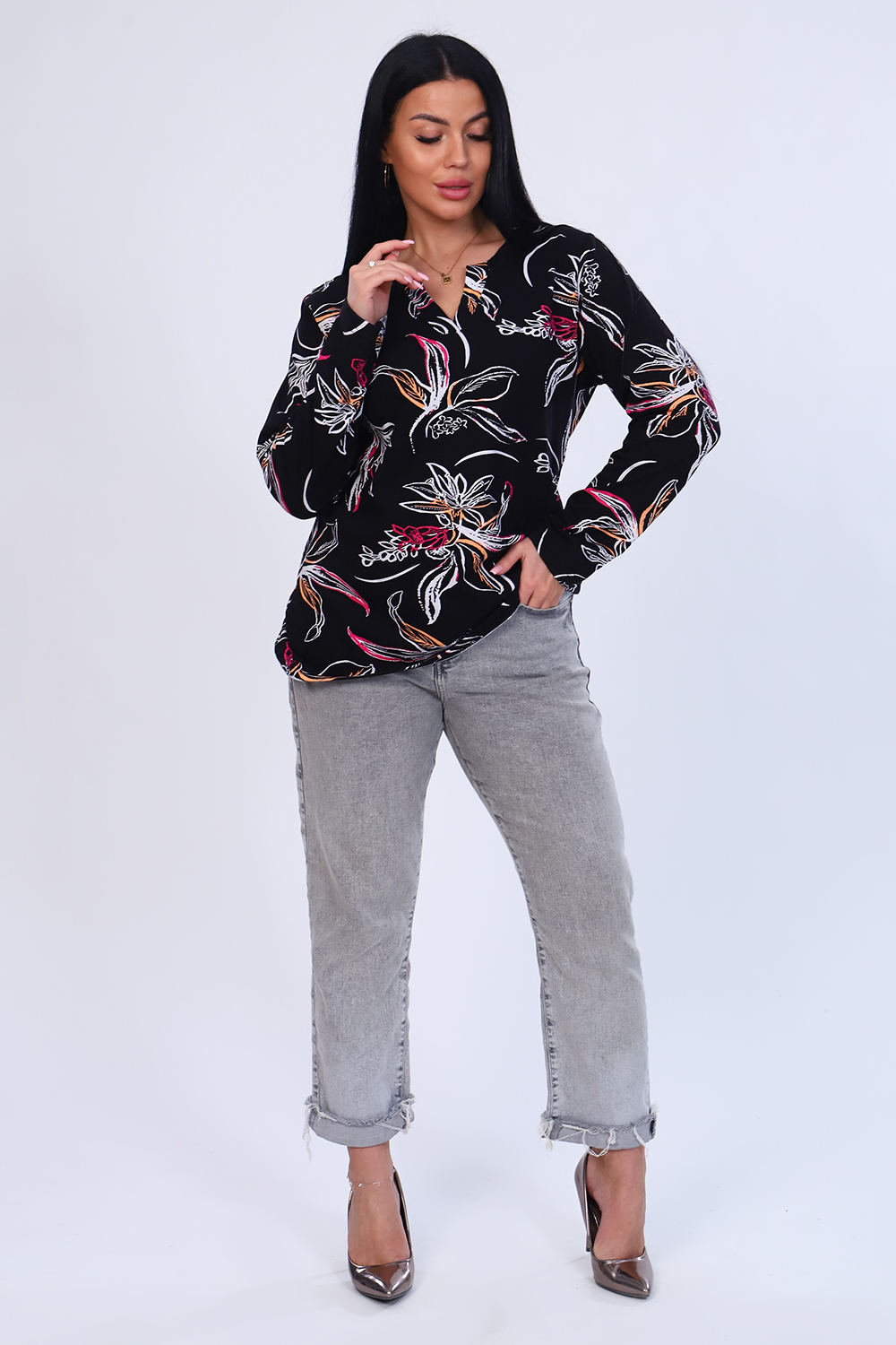 Туника женская с длинным рукавом из 100% хлопка. Оригинальная горловина с планкой без пуговиц. Низ изделия ассиметричен.