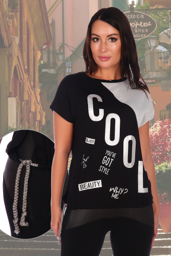 Туника свободного покроя со спущенным плечом выполнена из натуральной вискозы с отделкой из серебристого кашкорсе. На полочке напечатан принт серебром, который отлично сочетается с отделочной тканью. По низу изделия вставлен декоративный шнур-канат. Туника приятная к телу, подходит для повседневной носки.