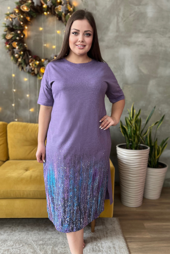 Туника полуприталенного силуэта, с удлиненной спинкой, с округлой горловиной. Рукав длинный. В нижней части боковых швов обработаны разрезы. Горловина обработана бейкой из основного полотна. На полочке эффектная аппликация из пайеток и печать